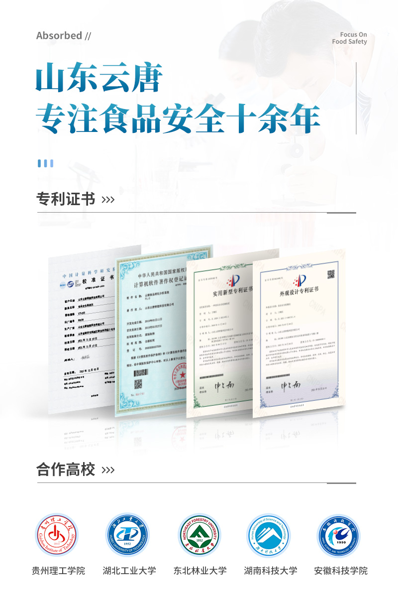 山東云唐智能科技有限公司生產(chǎn)的果蔬肉類檢測儀,采用手提箱式一體化設(shè)計,可快速檢測幾十種項目,包含各種蔬菜水果中有機(jī)磷和氨基甲酸酯類農(nóng)藥殘留,病害肉診斷:肉中組胺、揮發(fā)性鹽基氮;各種肉食品中瘦肉精激素類殘留、抗生素、獸藥殘留等現(xiàn)場的定性定量檢測。